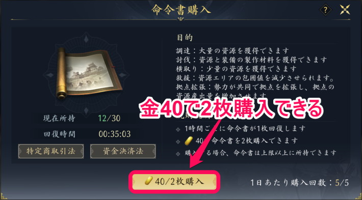 命令書は金40で2枚ずつ購入することも可能です。1日5回まで購入可能で、値段が変わることはありません。すぐに必要な場合に検討すると良いでしょう。