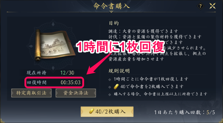 命令書の数は時間経過で回復します。1時間に1枚と計算しやすいペースとなっているため、寝る前などには命令書の数を確認しておきましょう。