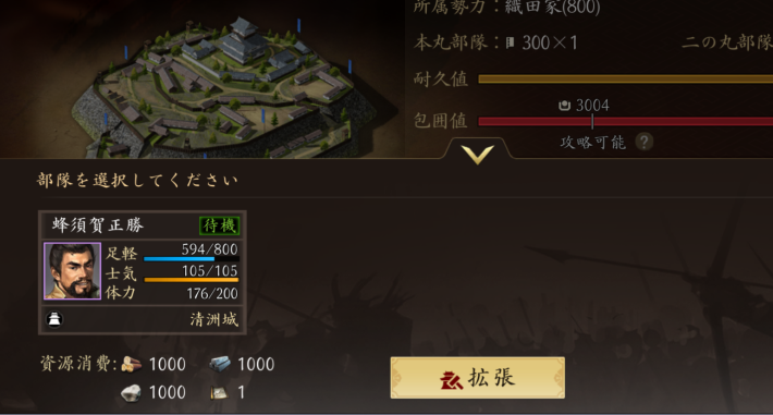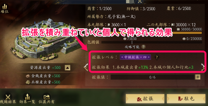 拡張を積み重ねて「拡張レベル」を上げると、勢力全体にかかるボーナスとは別に個人で恩恵を受けることができます。本城の産出量や個人で占拠できる知行地が増えるので、命令書に余裕があれば拡張も進めていきましょう。