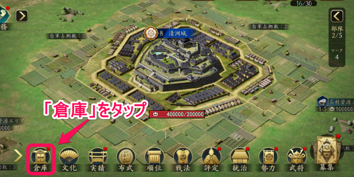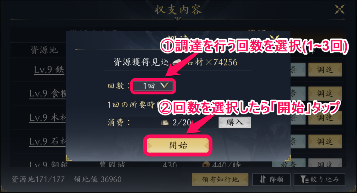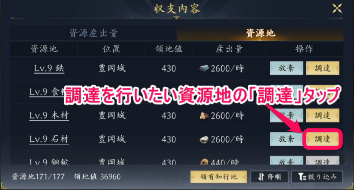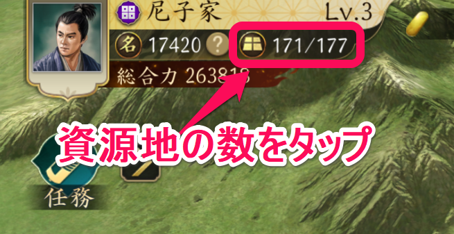 メイン画面左上の田アイコンから占拠している資源地の確認や調達が可能です。調達は短時間で大量の資源を獲得できる機能で、1回につき命令書を2枚消費しますが、攻略を進めるうえで非常におすすめの使い道となります。