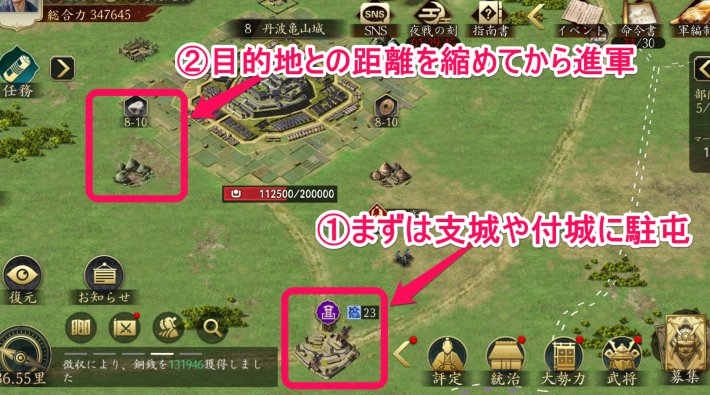 攻めたい目的地がある場合、居城から直接部隊を派遣するのではなく、必ず近くの支城や付城に駐屯させてから攻めるようにしましょう。進軍距離が短くなるため、士気の無駄な減少を避けることができます。