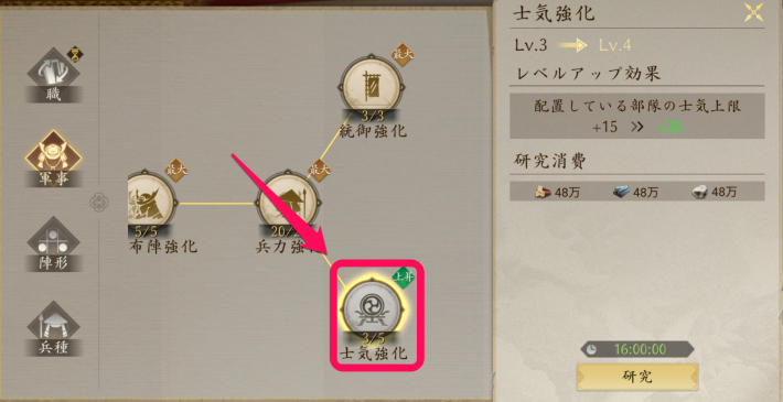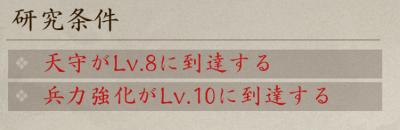 士気強化の研究には、天守レベル8とひとつ前の技術である「兵力強化」レベル10が条件となります。争覇地域に出るまでは影響がないため、研究を急ぐ必要はありません。