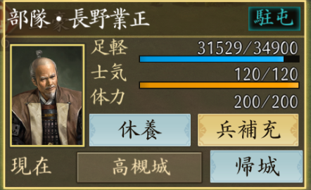 士気は進軍先での行動を終えて、拠点に着いた際に全回復します。体力や兵力のように回復に特別な操作は必要ありません。