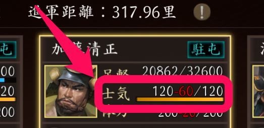 士気は、部隊の進軍距離に応じて減少する値です。進軍先が遠いほど減少量が増えるので、派遣前に士気の減少量は確認しておきましょう。