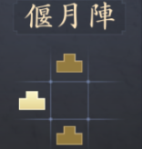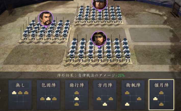 |  偃月陣 | 【効果】 部隊の自律戦法で与えるダメージ+20% 【解放条件】 ・天守がLv.5に到達する ・方円陣強化がLv.1に到達する |