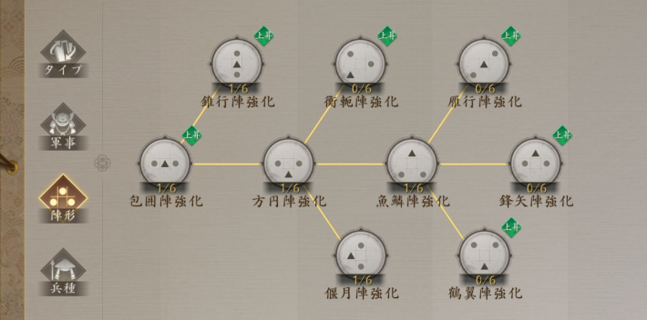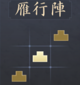 |  雁行陣 | 【効果】 部隊の追撃戦法・自律戦法の確率+5% 【解放条件】 ・天守がLv.6に到達する ・魚鱗陣強化がLv.1に到達する |