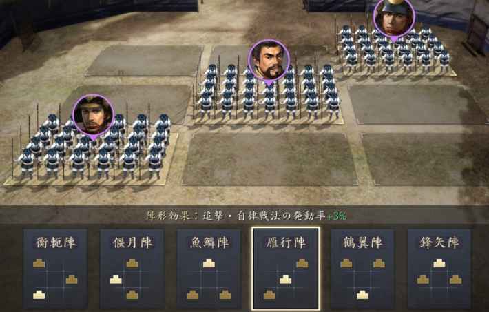 雁行陣は、自律戦法と追撃戦法の発動確率を最大5%上昇させる陣形です。特定の戦法の組み合わせで強力なコンボを決めたい場合は、雁行陣で安定感を高めると良いでしょう。
