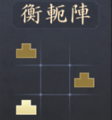 |  衡軛陣 | 【効果】 部隊の通常攻撃・追撃戦法で受けるダメージ-20% 【解放条件】 ・天守がLv.5に到達する ・方円陣強化がLv.1に到達する |