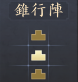 |  錐行陣 | 【効果】 部隊の進軍速度+20 【解放条件】 ・天守がLv.4に到達する ・包囲陣強化がLv.1に到達する |