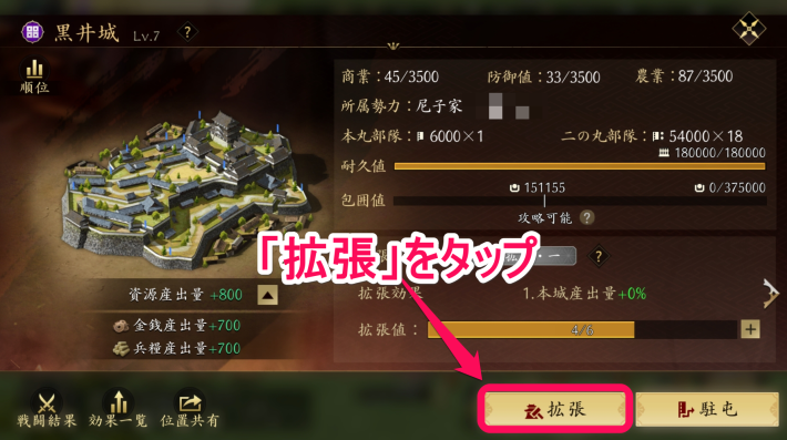 拡張は、任意の自勢力の拠点をタップして、右下の「拡張」から行える操作です。拡張開始から10分間が経過して拡張が完了すると拠点のレベルに関わらず一定の貢献度を獲得します。