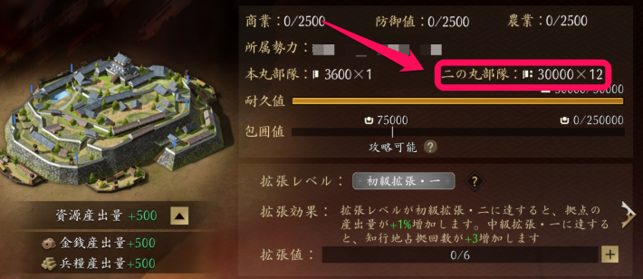 二の丸部隊とは、拠点を守っているNPCの部隊です。二の丸部隊との戦闘では撃破数に応じて貢献度を獲得できるため、戦功と合わせて一気に貢献度を稼げるタイミングとなっています。