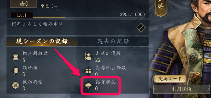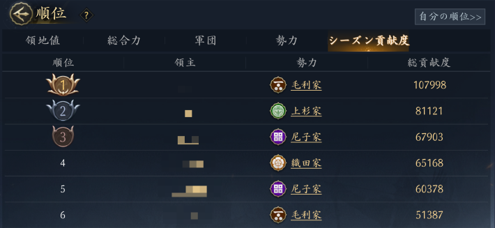 貢献度は、他勢力と戦闘を行ったり攻城戦に参加して獲得できる値で、自勢力への貢献を示しています。領主録の「総貢献度」はシーズンでの累計貢献度が表示されています。