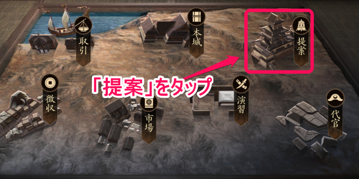 提案は「評定」画面から毎日受けられる任務です。武将を派遣してさまざまな報酬を獲得できますが、武将を派遣するのに銅銭を消費します。