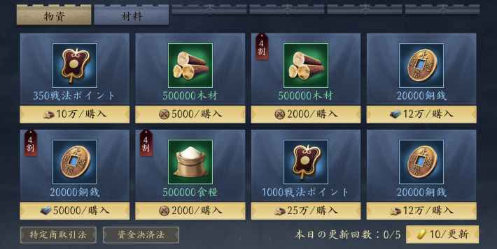 物資市場では、木材や石材といった資源と銅銭を交換することができます。基本的には資源が余るようになってから利用するのがおすすめです。