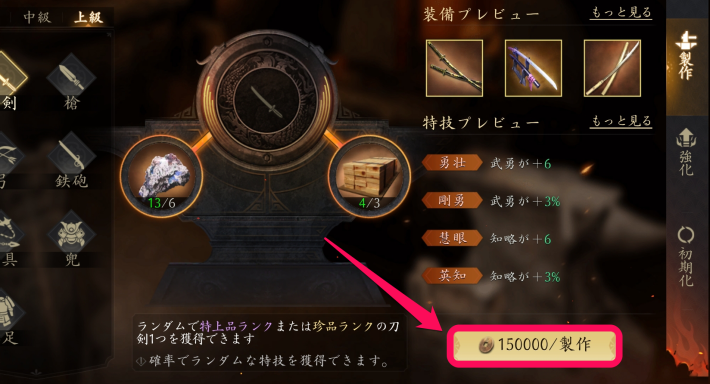 ▼装備の製作 | 【おすすめ度】★★★★☆ ・武将の強化に繋がる |