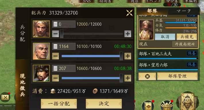現地徴兵は、食糧と銅銭を消費して特定の部隊に直接徴兵を行う機能です。コストはかかりますが、通常の徴兵とは別で兵を集められるため戦闘が激しい場合に有効です。