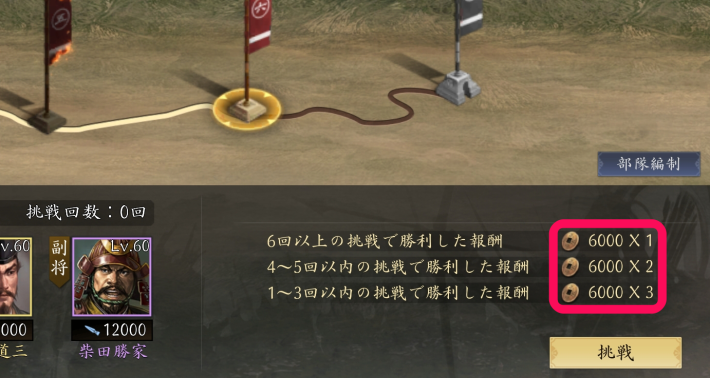 ▼演習の報酬 | 【おすすめ度】★★☆☆☆ ・他の資源や金も獲得 ・銅銭が出るかは運 |