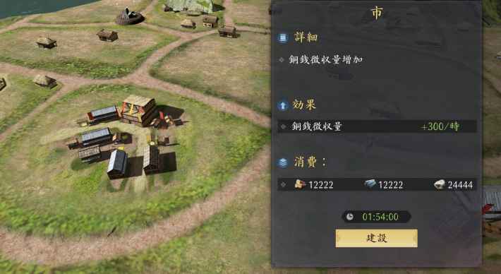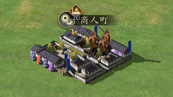 銅銭に関連した城下町施設を建築・改築することで銅銭の徴収量を増やせます。特に改築後の「商館」は1時間ごとの徴収量が1200増加するため、序盤から狙いたい重要な施設です。