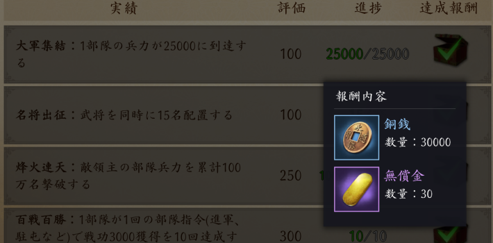 実績は、ゲームのやり込みに応じて達成される目標です。簡単に達成できる実績は少ないものの、ひとつ達成するごとに銅銭を30000、金を30獲得できます。