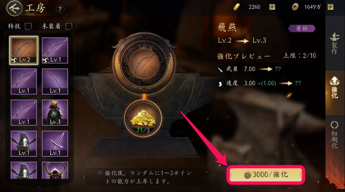 作成した装備に対して、砂金と3000銅銭を消費することでレベルを上げられます。強力な装備はしっかり強化を進めましょう。