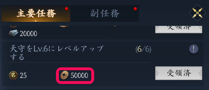 銅銭は主要任務や副任務の報酬として獲得可能です。名声や資源といった報酬も獲得できるほか、序盤においては重要な収入源となるため、意識しておくと序盤で有利に進められます。