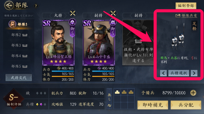 足軽強化の効果は、武将の足軽適正に関係なく、部隊の兵種を足軽に設定するだけで武将全員が恩恵をうけることができます。