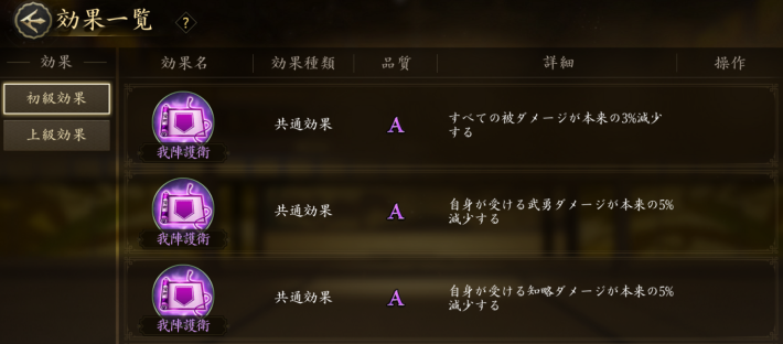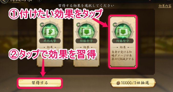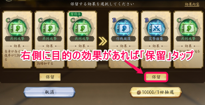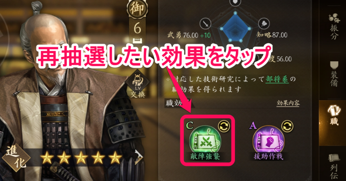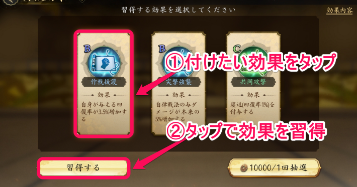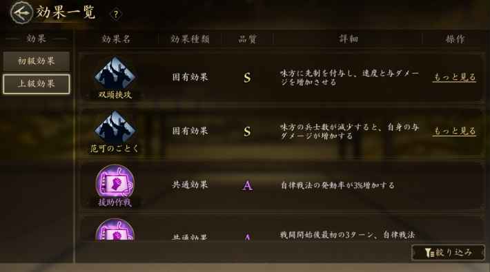 上級効果の抽選では、Sランク効果を狙うのがおすすめです。武将ごとに固有の効果を持ち、場合によっては大きく性能が変化するような効果も存在します。