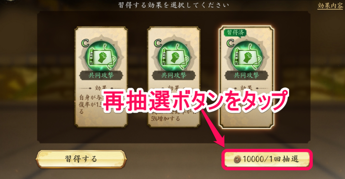 初級効果の再抽選には銅銭×10000、上級効果の再抽選には効果書×1を消費します。このコストは何回再抽選しても変わることはありません