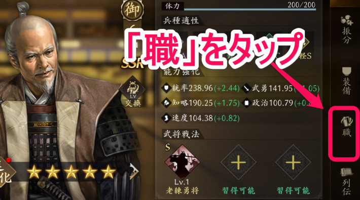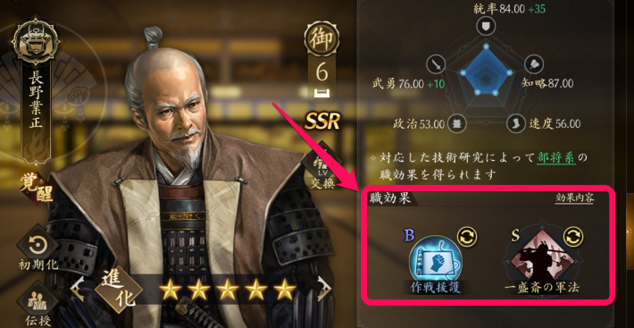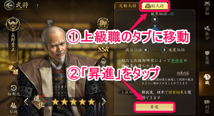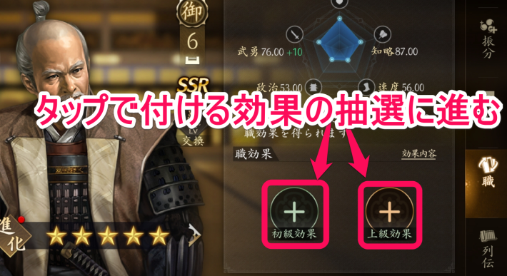 上級職の大きな特徴は、目玉となる効果が武将ごとに異なる点にあります。戦闘の安定感が増したり、もともとの強みが更に際立つような効果を持つ武将はおすすめといえます。