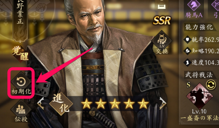 上級職になった武将は、覚醒や進化と同様に「初期化」機能で初期の職に戻すことが可能です。職昇進に消費した武将も返還されます。