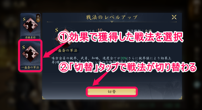 固有戦法に効果が追加されるものに関しては、習得しただけでは効果を発揮できません。固有戦法をタップして、自身で切り替える必要があります。