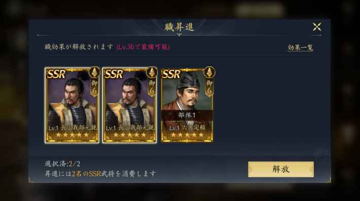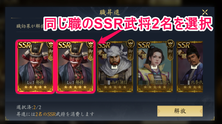 上級職への昇進には同じ職のSSR武将が2名必要となります。違う職のSSR武将や覚醒済みの武将は素材として使えないので注意しましょう。また、強化用の武将である「部将」は、同じ職である足軽大将の昇進にのみ利用できます。