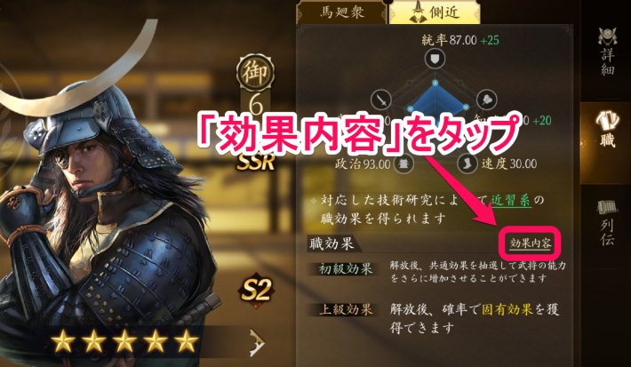 抽選される職効果の一覧は、職画面の「効果内容」をタップすることで確認できます。未所持の武将であっても図鑑から確認可能なので、武将の入手や育成の指標にもなります。