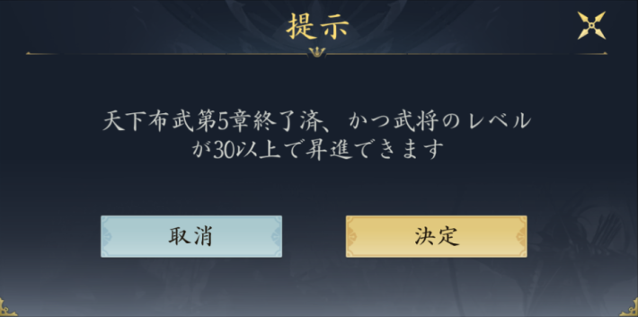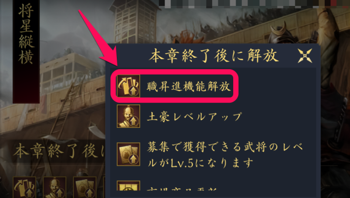 職昇進機能は、天下布武第5章『将星縦横』が終了すると同時に解放されます。シーズン2であるのに職昇進機能が利用できない場合は、天下布武の進行状況を確認しましょう。