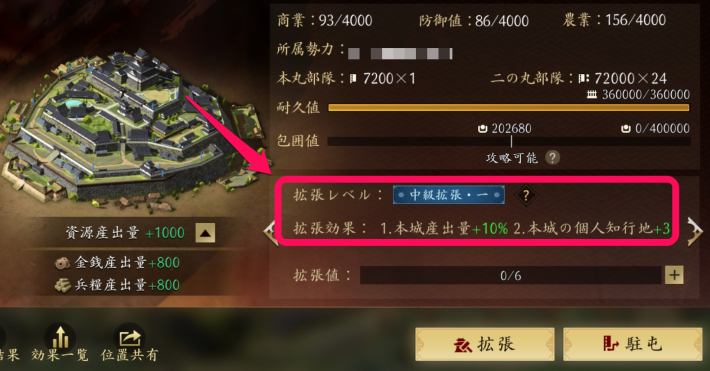 知行地占拠可能数は、名城の拡張で増やすのがおすすめです。拡張レベルを中級まで上げた場合はその名城の知行地を3つ、上級なら6つまで占拠可能となります。