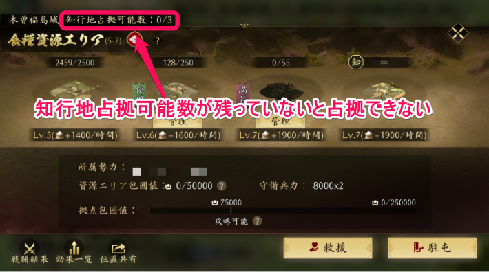 知行地の占拠には、資源地とは別に専用の占拠可能数が必要です。占拠できない場合は、資源地画面左上の占拠可能数を確認しましょう。