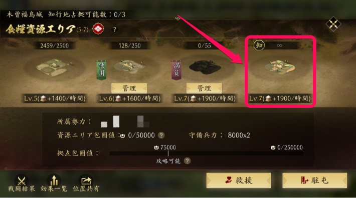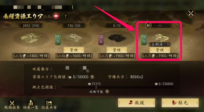 知行地は、他のプレイヤーと奪い合いになることはありません。そのため、わざと占拠せずに、資源地の部隊と戦闘を繰り返すことで、効率良くレベルを上げられます。