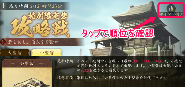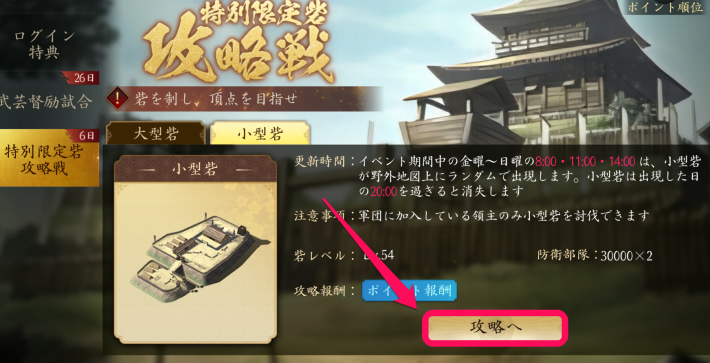 小型砦は金~日曜日の8:00・11:00・14:00に野外地図上にランダムに出現します。名城の周辺に出現し、軍団に所属していれば早い者勝ちで攻略が可能となっています。