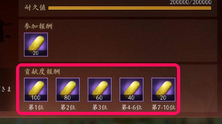 大型砦は1ポイントでも貢献度を稼げれば、参加賞として無償金20を獲得できるようになっています。二の丸撃破が難しい場合や、前線から動けない場合でも普段使わない部隊を動かす価値はあるでしょう。