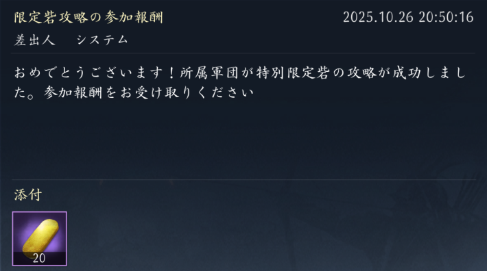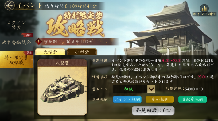 『特別限定砦 攻略戦』では、砦の攻略で撃破した二の丸部隊の兵力と減少させた耐久値に応じてイベントポイントを獲得します。個人順位と軍団順位に応じた金を獲得します。