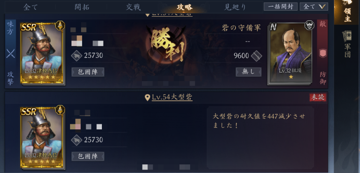 大型砦の二の丸部隊は高レベルの居城と同等かそれ以上の強さを誇ります。1軍を前線から下げるのは戦況によっては注意が必要ですが、二の丸部隊の撃破を目指すならできるだけ強力な部隊で挑みましょう。