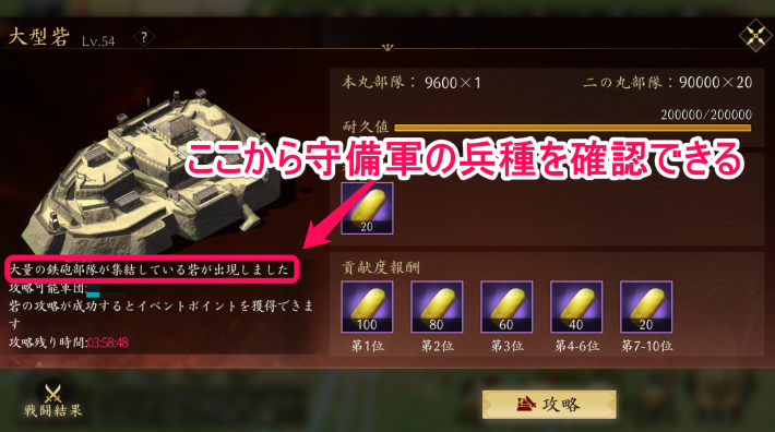 大型砦をタップすると、左側の文章から守備軍の兵種を確認できます。中には、鉄砲などNPCが普段使わない兵種で戦ってくることもあるため注意が必要です。