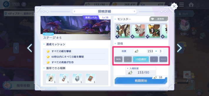 三つ星でクリアしたステージは「掃討」が解放されて、次回から戦闘をスキップすることができます。スキップ機能を使って効率よく経験値を稼ぎましょう。
