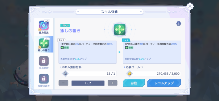 | Tips! | 最大レベルまで強化すると、ランクアップすることができスキル効果がさらに強力になります。 |