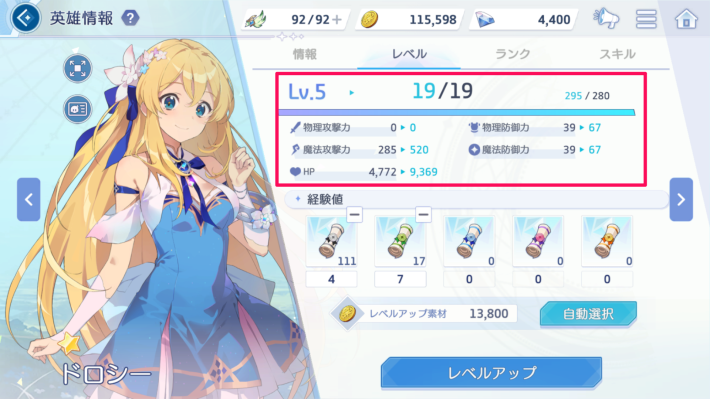 キャラクター(英雄)のレベルを上げると、基礎ステータスが上昇します。経験値アイテムとゴールドを消費することで上げることができ、複数のステータスを同時に大きく強化できるため、優先的に行うのがおすすめです。