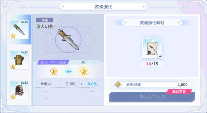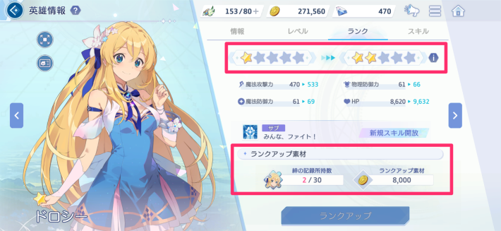 ランクアップを行うと、そのキャラに対応したステータスが上昇します。これに加えて、星1→星2の強化ではサブスキルが、星2→星3の強化ではパッシブスキルを獲得できます。そのため、低ランクキャラほど優先度が高い強化項目となっています。