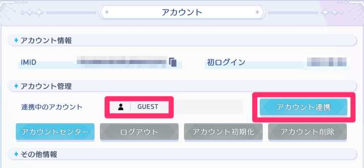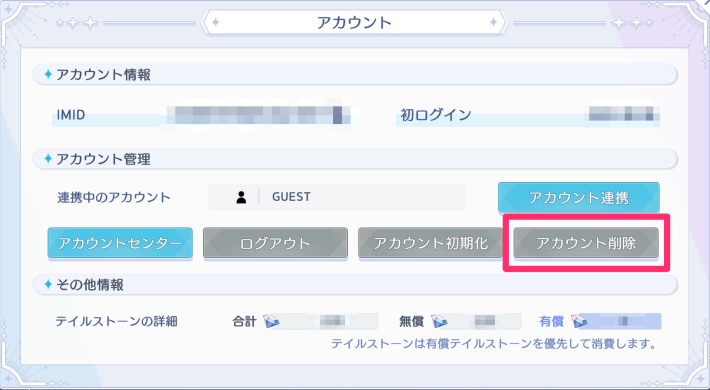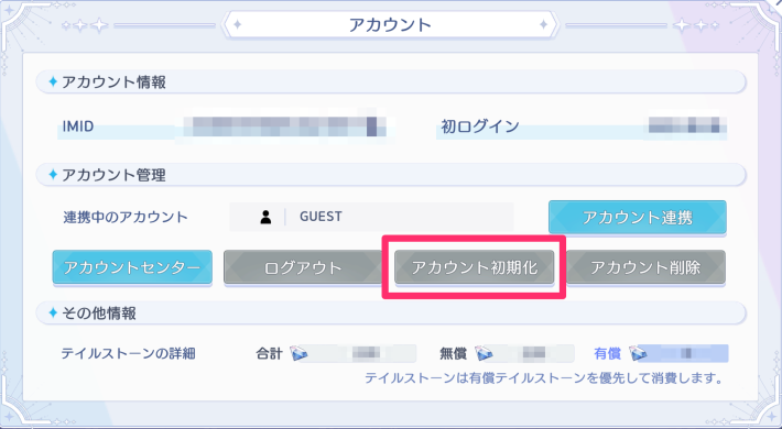 アカウントメニューから初期化することができます。アカウント初期化の場合、データはリセットされますが、再開してもIMIDは変わらず初期設定やプロローグはスキップできます。