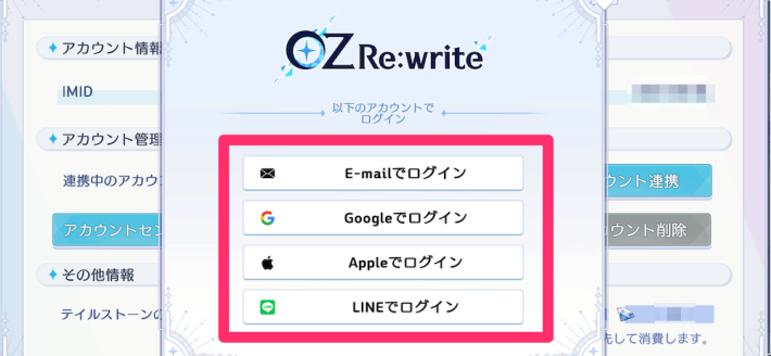 オズリライト(OZ Re:write)のアカウントの連携・引き継ぎ方法です。アカウント連携やアカウント削除、初期化のやり方について掲載。オズリラアカウント連携にお役立て下さい。