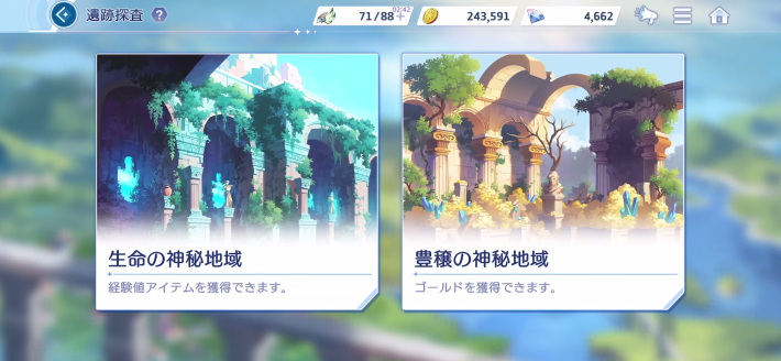 遺跡探査は、APを消費して経験値アイテムかゴールドを獲得できるコンテンツです。2つの地域から選んで挑戦することができ、生命の神秘地域では経験値アイテム、豊穣の神秘地域ではゴールドを獲得可能です。