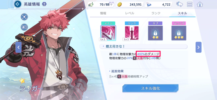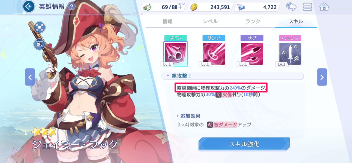 ![]() | ・赤属性のファイター ・メインスキルの合計ダメージが高い ・耐久力の低さに注意 |